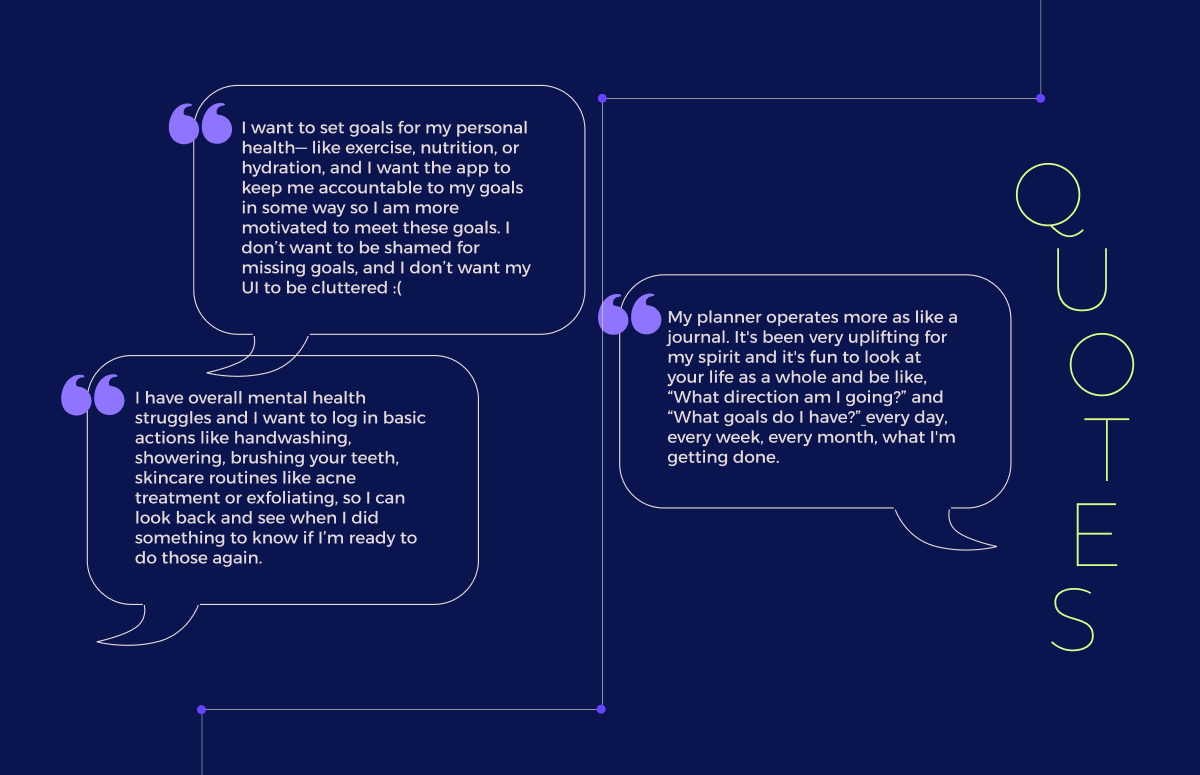 To gain deeper insights, I conducted interviews with individuals who’ve been exploring wellness apps in the market. To me, what began to stand out was how no one had a single app that met all their wellness needs. They needed to combine the usage of 2-3 apps on top of a journal or a planner— to track their nutrition, to time their meditations, to write checklist reminders, to manage their sleep, to set alarms.
