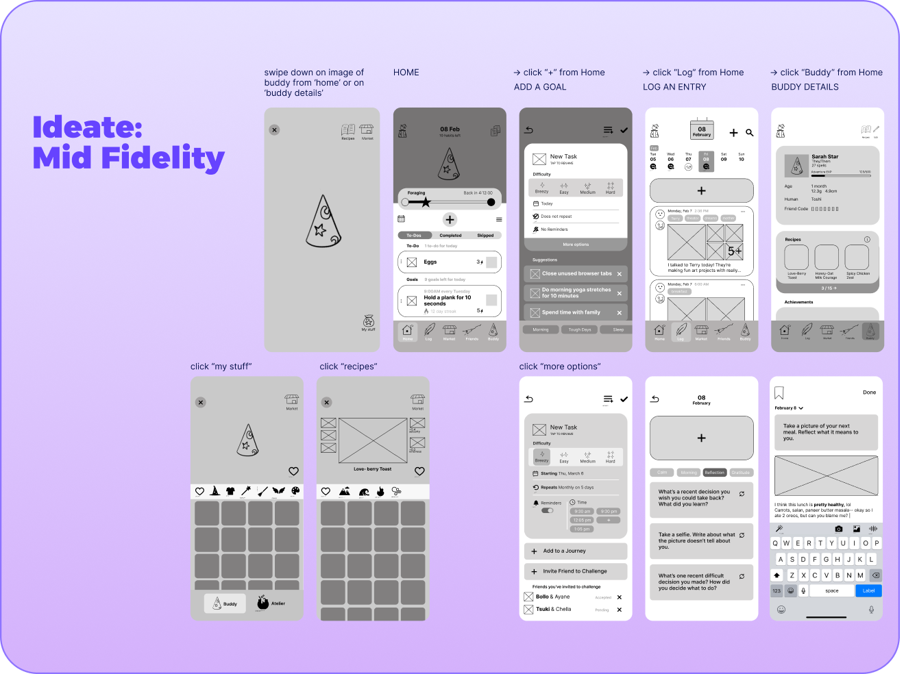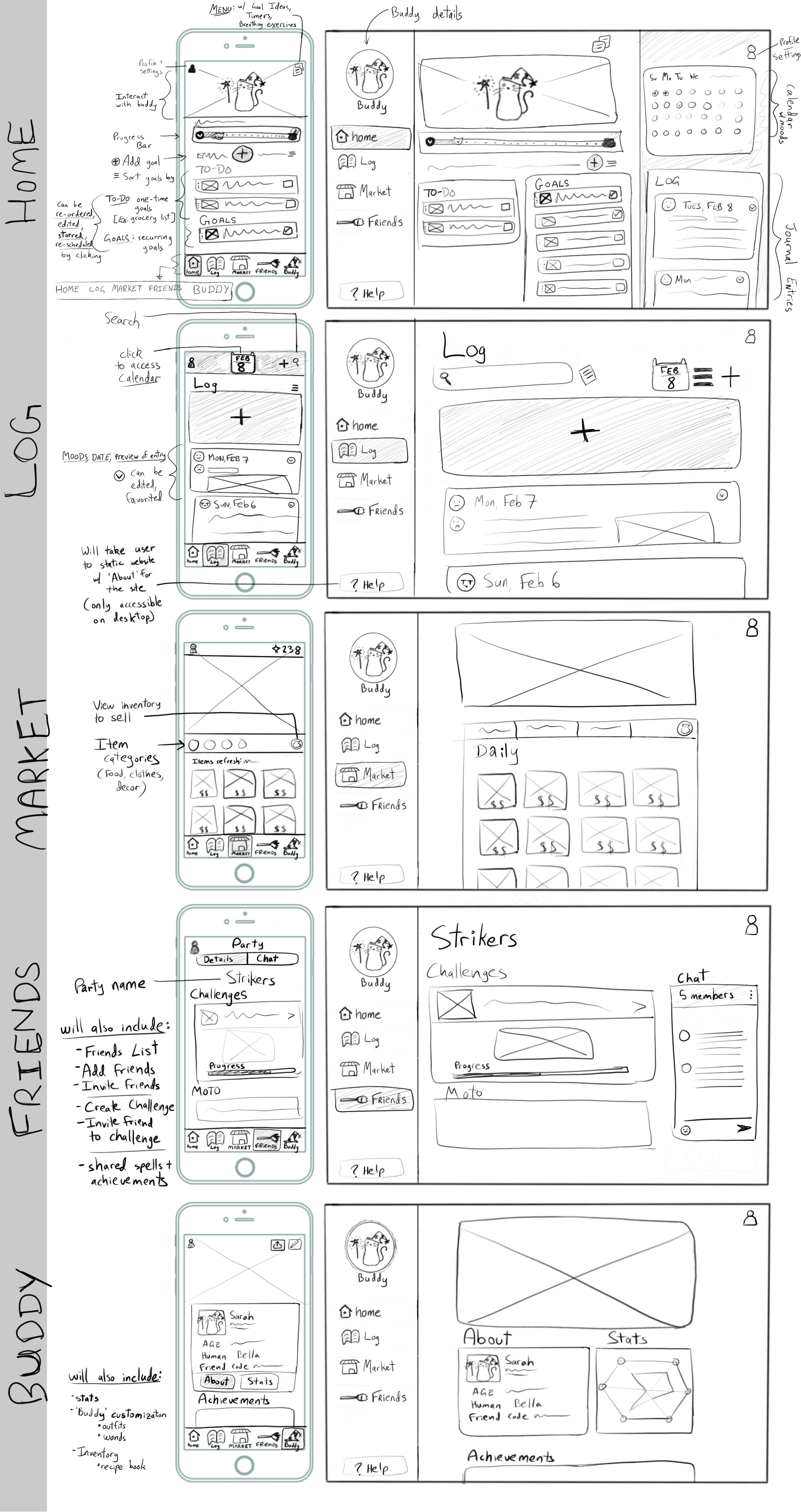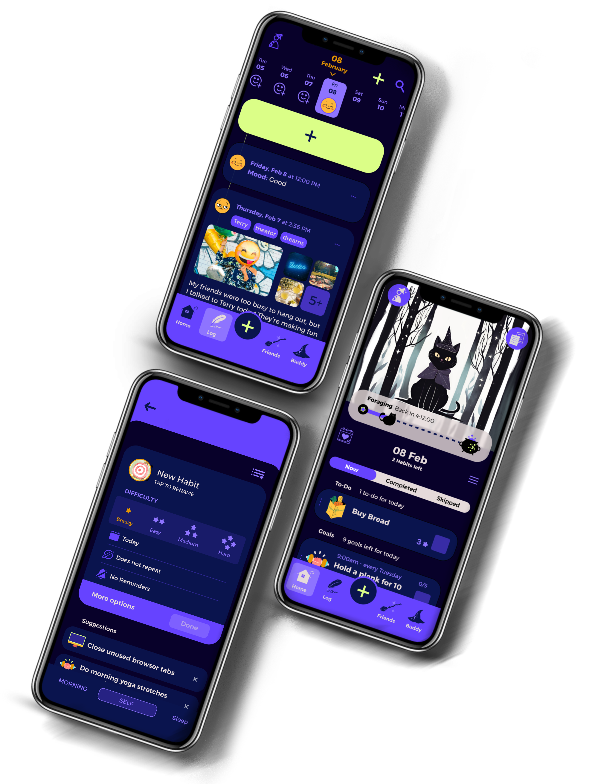 You can create goals, set reminders, log your moods, write about your day, connect with your friends, and more! Upon opening the app, you will embark upon your own personal quest of self-improvement. And every step of the way, you’ll have your Buddy there to help you— An animal companion of your choosing who will learn and grow alongside you, brewing collectible potions and spells.
