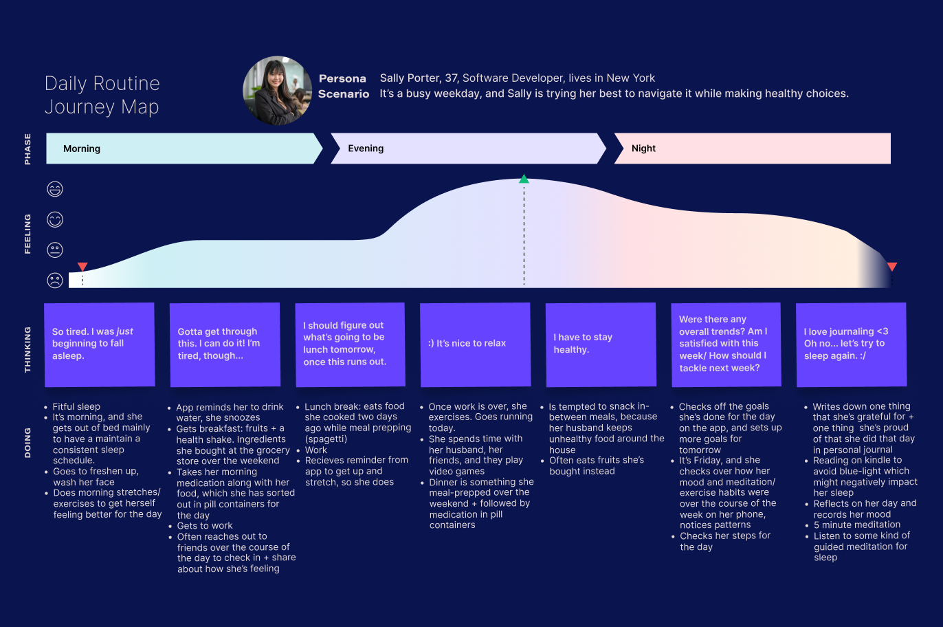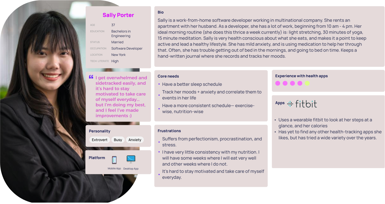 With these insights in mind, I developed personas to encapsulate the motivations, needs, and pain points of our target demographic: busy young adults with their respective struggles on their journeys towards better mental and physical health.