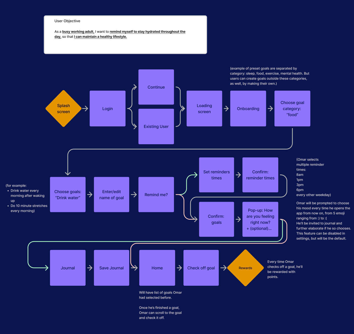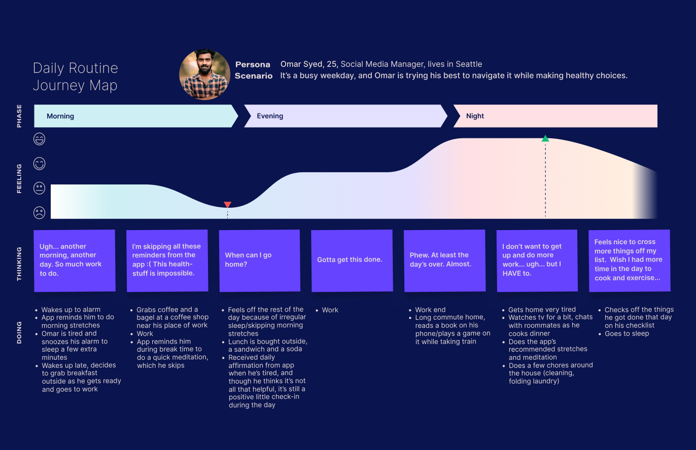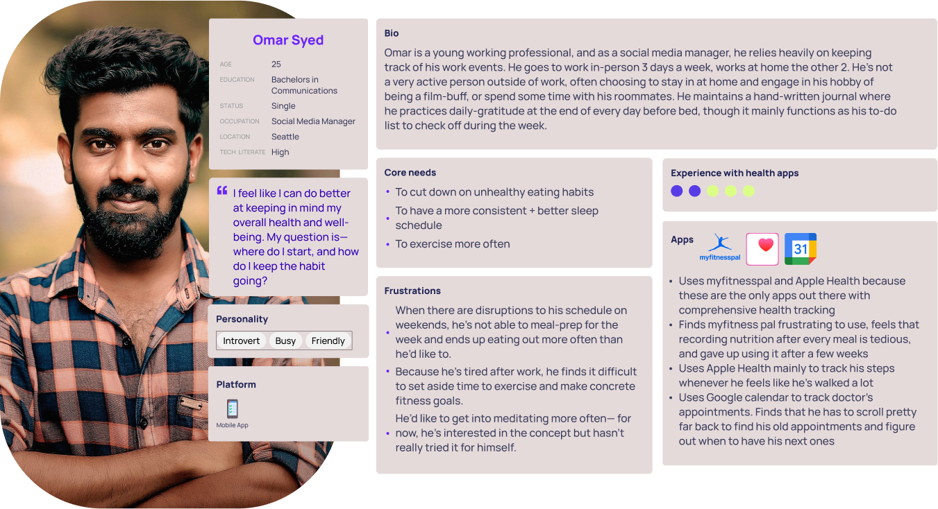 Omar represents our group of users who are dipping their toes first-time into thinking more about their holistic health and well-being everyday, but find it difficult to integrate well-being into their schedules.
