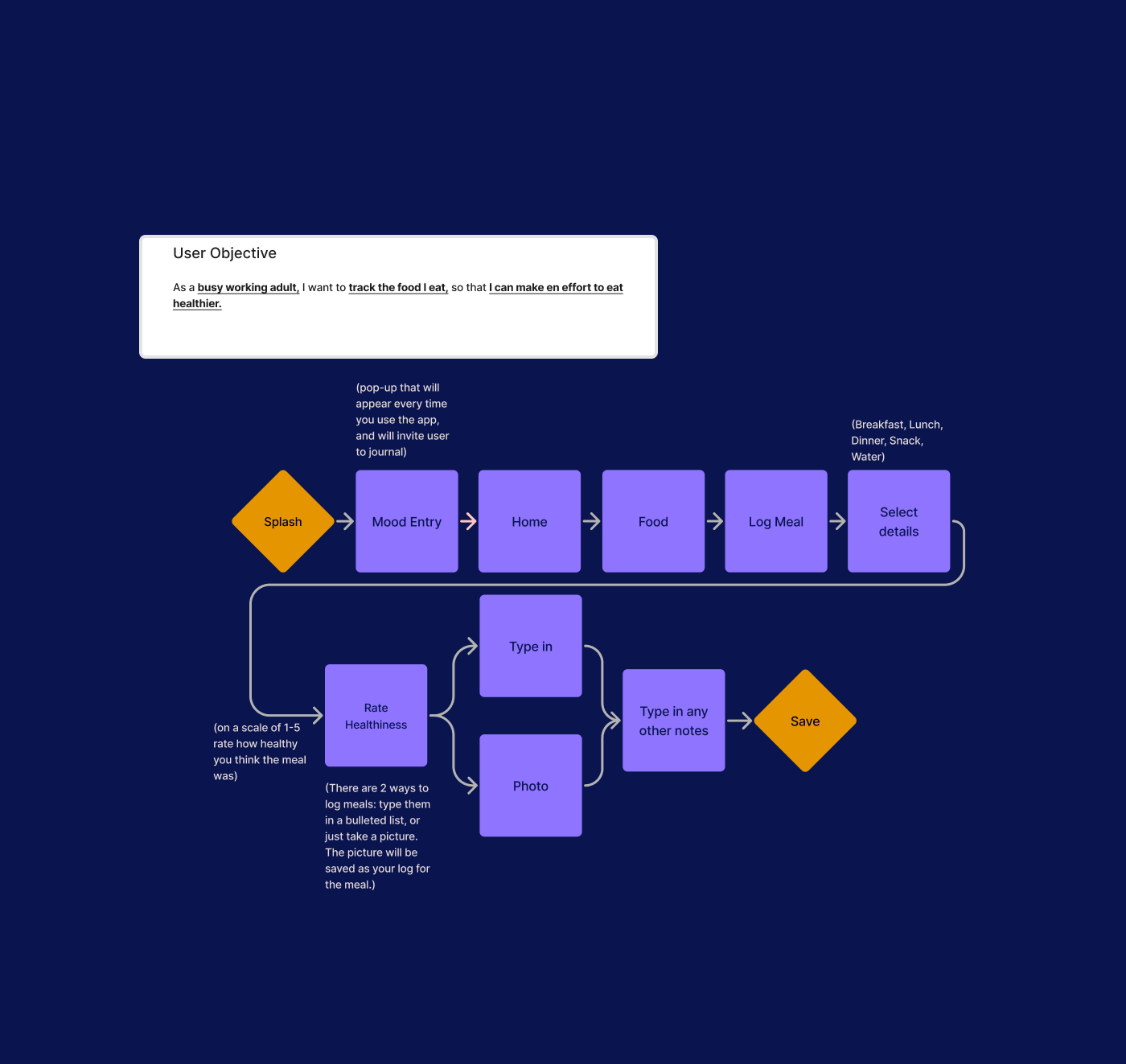 - Offer meal prep app + allow her to log foods she’s eaten (maybe through a quick picture, instead of manual typing) so she can see an overall look at the end of the week of what she’s eaten