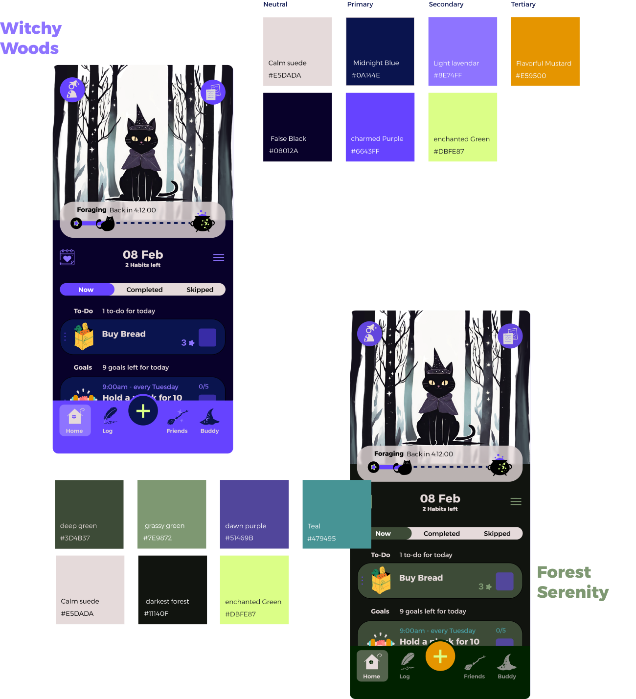 Users will have the option to choose their color theme from a range of 5 when the open the app, two of which are depicted below: Witchy Woods (the default theme) and Forest Serenity.