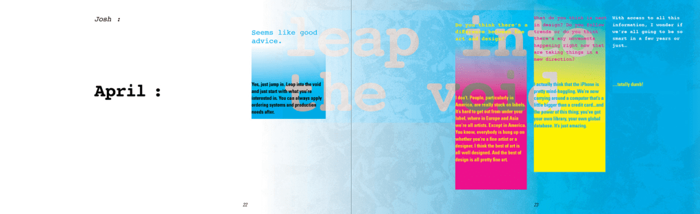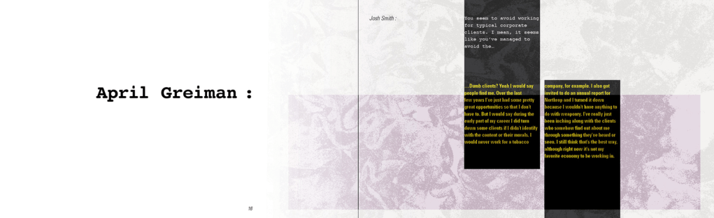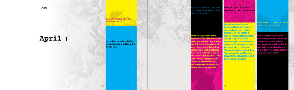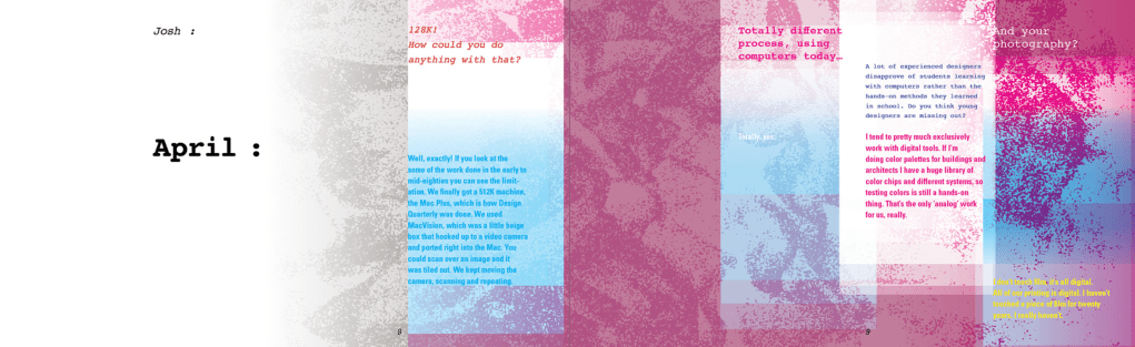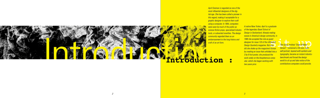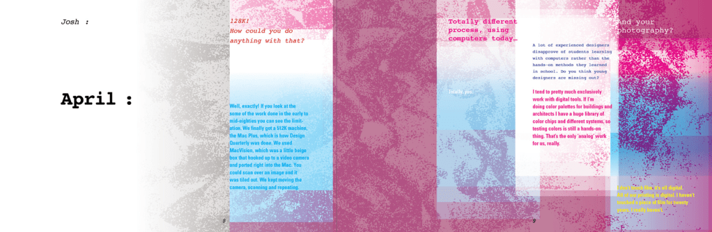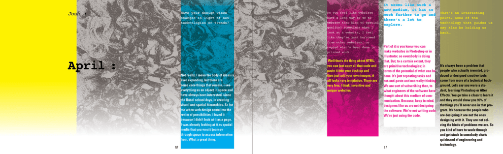 I researched April Greiman’s creative work in an effort to develop an interview booklet inspired by her style and accomplishments. I settled on a mixture of bright, saturated colors and textures that reminded me of April Greiman’s forays into unknown territories, as she shaped graphic design into what it is today.
