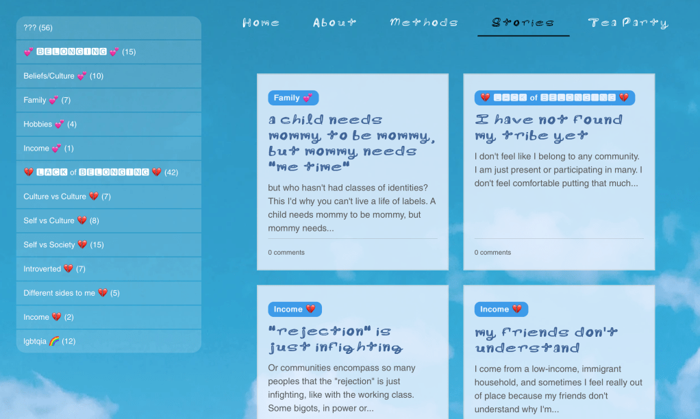 Research conducted for this project came as a google forms survey probing into the thoughts and experiences collected from 33 different individuals. The conclusions I came to became a thorough investigation into what it means to have so many different identities as a human being.